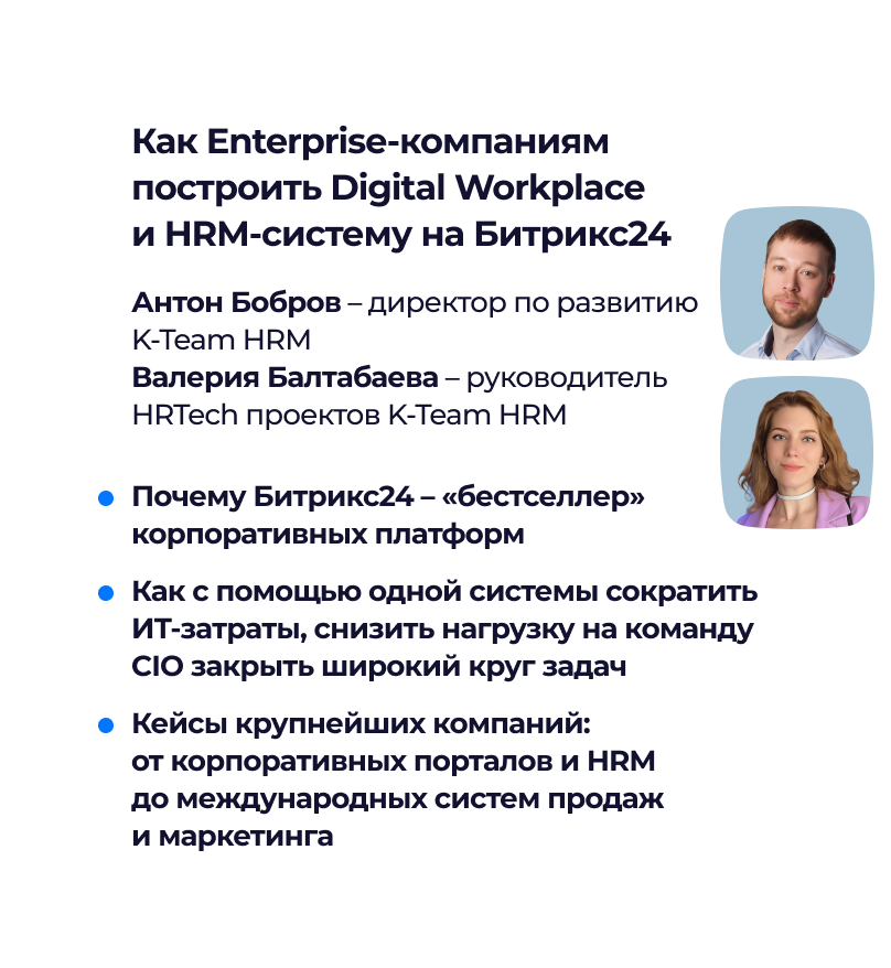 K-Team— готовая HRM-система на базе «Битрикс24», продуманная до мелочей. Охватывает все этапы взаимодействия с персоналом: от приема на работу